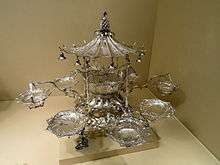 -  A table centerpiece, usually made of silver, generally consisting of a central bowl with radiating dishes or holders.