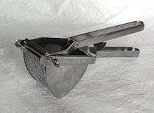 - (cooking) A utensil used to extrude soft foods (such as, and especially, cooked potato) through holes about the diameter of a grain of rice.