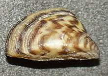 - A striped freshwater mussel, Dreissena polymorpha, originating in Russia.
